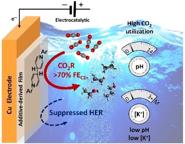 Organic Additive-derived Films on Cu Electrodes Promote Electrochemical CO2 Reduction to C2+ Products Under Strongly Acidic Conditions